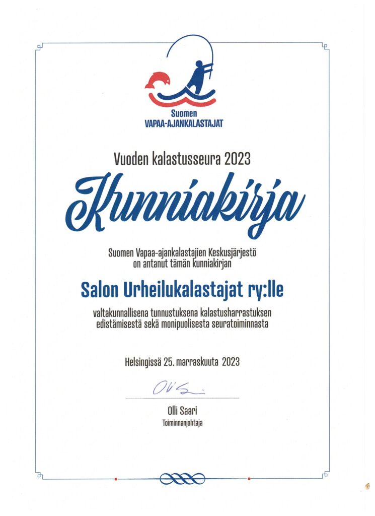 Suomen Vapaa-ajankalastajat valitsi Salon Urheilukalastajat vuoden 2023 kalastusseuraksi: monipuolinen ja avoin toiminta vakuutti valitsijat