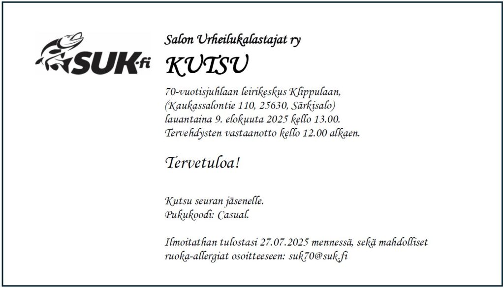 Seuramme 70-vuotisjuhlan yhteydessä Klippula on vuokrattu seuralle 08-10.08.2025. Viikonlopun aikana sinulla on mahdollisuus juhlistaa toimintaamme esimerkiksi kalastamalla. Ilmoittautuessasi juhlaan (ohjeet kutsussa) kerro myös mahdollinen majoitustarpeesi, sekä ajankohta yöpymistilojen riittävyyden varmistamiseksi.